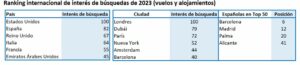 El interés de España como destino turístico ha aumentado en 2023 respecto a 2022 según las búsquedas relativas a vuelos y alojamientos realizadas en Google desde fuera de España. La demanda se ha incrementado entre un 10 y 25 % y destacan tres destinos donde el incremento se dispara por encima del 50 %: Donostia – San Sebastián, Santa Cruz de La Palma y Fuengirola.