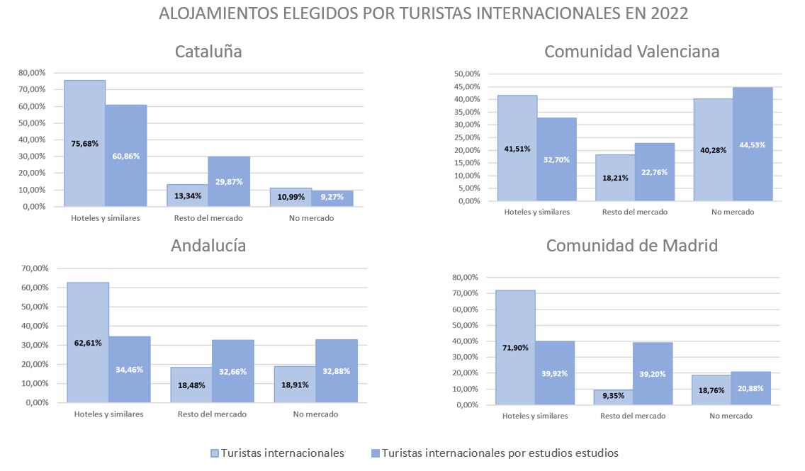 La Comunidad Valenciana es el caso más notorio del cambio del tipo de alojamiento en los turistas por estudios entre las regiones que más turistas reciben. El hotel pasa a ser la segunda opción, hasta un 12 % por debajo de las opciones de fuera del mercado. Mientras, en Andalucía prácticamente el alojamiento se reparte de forma uniforme entre las tres opciones, pese a que el turista internacional generalmente elige el hotel en Andalucía en más de un 60 %.