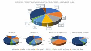 El número de turistas internacionales por estudios que llega a España aún no ha recuperado las cifras previas a la pandemia, aunque en 2023 la llegada se aproxima más al número de entonces y mejora notablemente las cifras de 2022. Sin embargo, en lo referido al gasto, el total de estos turistas en 2022 ya superó las cifras de 2021 en un 10 %. El dato es significativo porque el gasto general del turista internacional el pasado año sigue siendo algo inferior al de 2019.