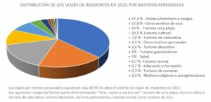 En 2022, solamente en la Comunidad de Madrid, en la Región de Murcia y en La Rioja este tipo de viajes de residentes representó una cifra que rondaba el 2 % del total. En el primer trimestre de 2023, sólo Castilla – La Mancha y la Comunidad de Madrid presentaban esas cifras.